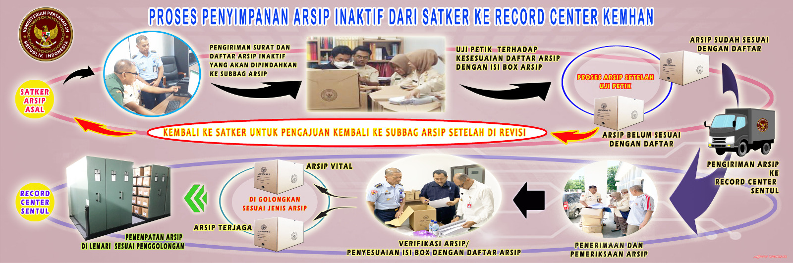 Keterangan : Kemhan telah memiliki gedung record center di Sentul, Bogor. Berikut alur pengiriman arsip dari satker ke Record Center Sentul.